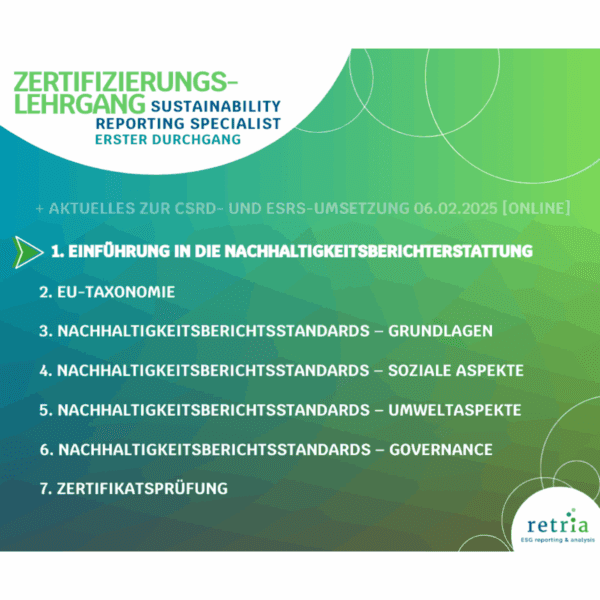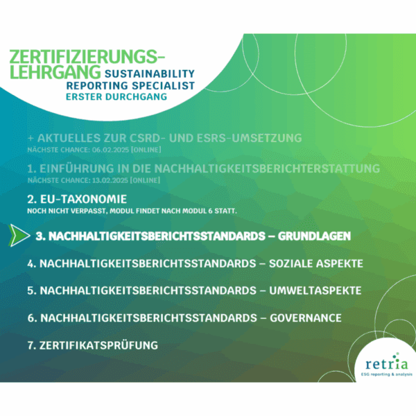 Erweitere dein Wissen über Nachhaltigkeitsberichterstattung! Am 23./24. September 2024, von 9:15 bis 12:45 Uhr, starten wir mit unserem nächsten Modul im Rahmen des zertifizierten Lehrgangs „Sustainability Reporting Specialist“: Nachhaltigkeitsberichtsstandards –…