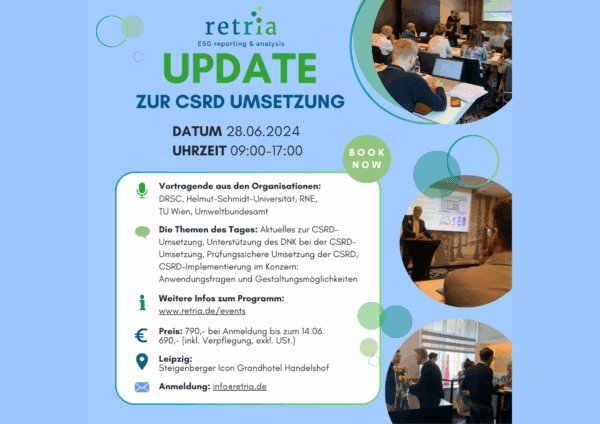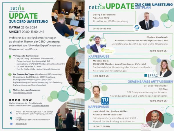 Einladung zum Seminar: Updates zur CSDR-Umsetzung in Leipzig! Profitieren Sie von fundierten Vorträgen zu aktuellen Themen der CSRD-Umsetzung, präsentiert von führenden Expert*innen aus Wissenschaft und Praxis. Datum: 28.06.2024 Ort: Leipzig…